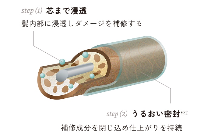 プロのサロントリートメントの核となる「内部浸透」と「コーティング」のステップケアを、ホームケアで実現。週1回、置き時間なしの2ステップケアで、髪の芯から表面までを集中補修します。